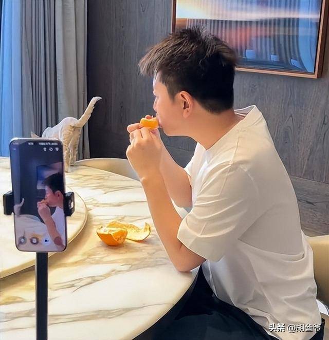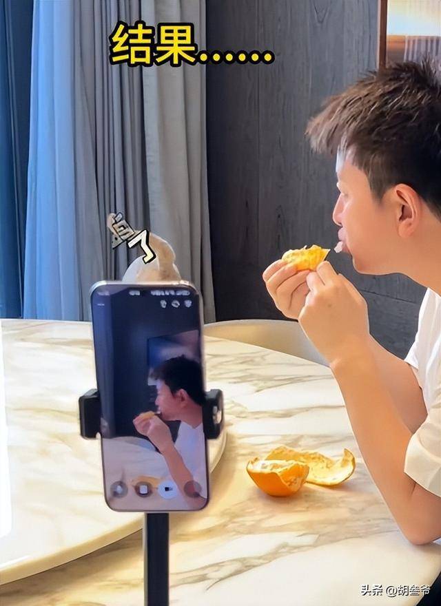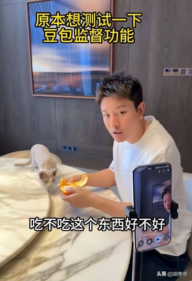 视频里,他一个人坐在硕大的客厅里吃橘子,身边没有助理,没有工作人员,只有一只名叫MiuMiu的猫乖乖趴在桌上陪着他。