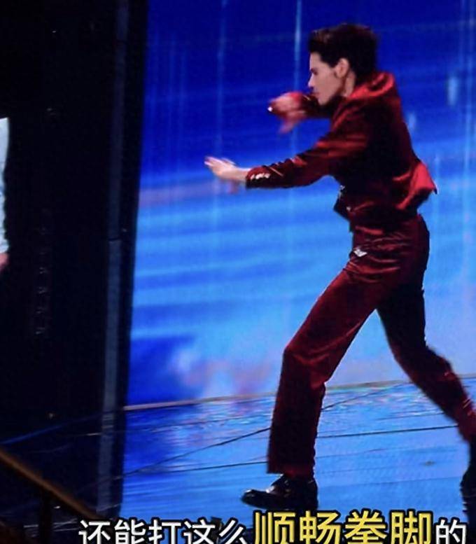 表演嘉宾向佐身着丝绒西装,刚完成一套拳法展示。