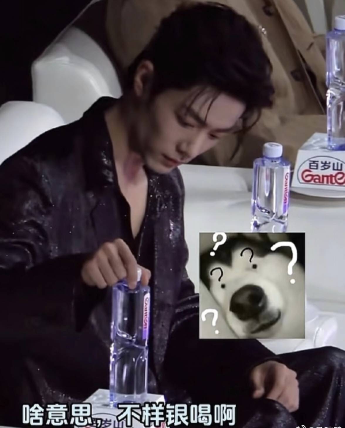 事情是这样的,活动内场,肖战大概是觉得口渴了,随手就想拿起面前桌上的百岁山润润喉。结果,这一拿,差点没把咱们战战CPU干烧了——这水瓶就像焊在了桌子上一样,纹丝不动!