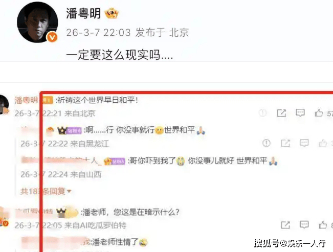 几乎就在同一时间线,3月7日晚上,潘粤明的微博更新了。没有配图,没有前因后果,只有一句“一定要这么现实吗……”。二十分钟后,他在这条微博下自己评论了一句:“祈祷这个世界早日和平”。就是这没头没尾的八个字,加上一个突兀的“世界和平”,瞬间点燃了全网福尔摩斯的探案热情。时间点卡得如此微妙,很难不让人联想到这是对前妻那番“接受现实”表态的隔空回应。潘粤明这条微博的点赞量迅速突破50万,评论区涌入超过20万条留言,全是各种猜测和解读。
