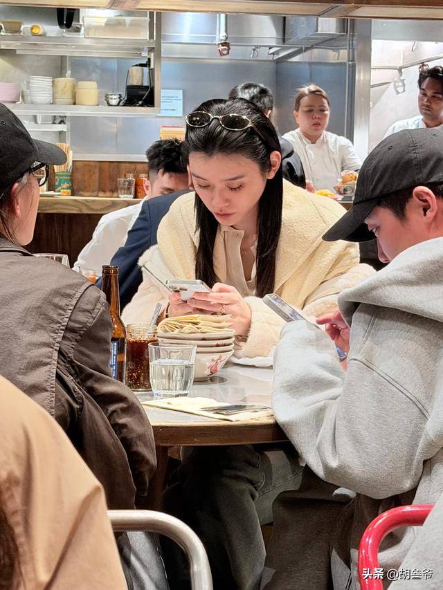 从网友分享的画面看,她就坐在主打泰式风味的samsen餐厅里,完全没做造型,素着脸就来了。