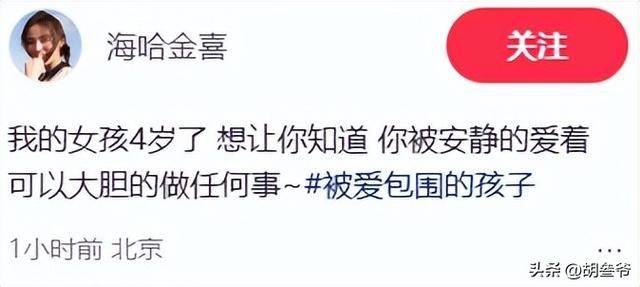 海哈金喜在社交平台发了个视频给女儿庆生,配文写着:“我的女孩4岁了,想让你知道,你被安静的爱着,可以大胆的做任何事。”