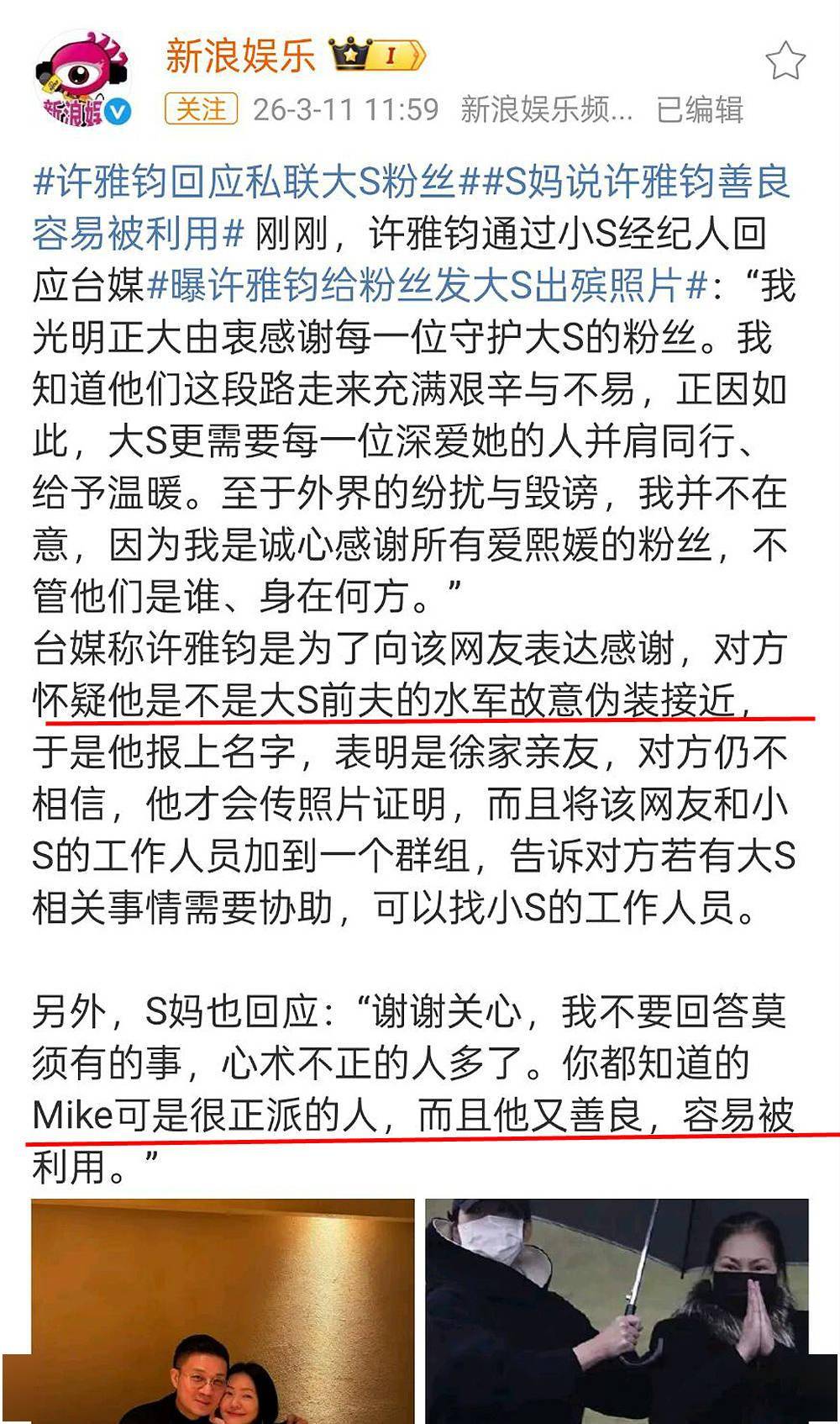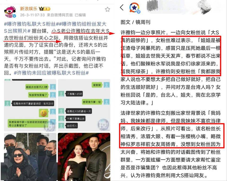 在3月11日早网上流传起小S的丈夫许雅钧突然被台媒踢爆私联粉丝,为了自证身份给大S粉丝发大S的出殡照片,并且提醒“这是送大S的最后一天,千万不要传出去”!这一新闻引起了轩然大波,台媒有的报道还特地点出该女粉丝的颜值颇高,于是很多人认为这点增加了新闻的可信度,在很多人眼里许雅钧便是这样的人,纷纷表示人设不倒,只是做人不能太许雅钧,亲人去世还有这心思?大S的葬礼成为了他和女网友play的一环吗?