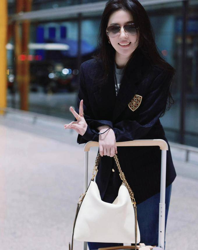 当她身处机场时,她所穿的藏蓝色的学院风格西装与一条价值高达一万元的LV品牌牛仔裤相得益彰。她脚上穿的那双白色阿甘鞋,给人一种相当年轻的印象。她所穿的这一套服装,散发出了一种乖巧学生的氛围。