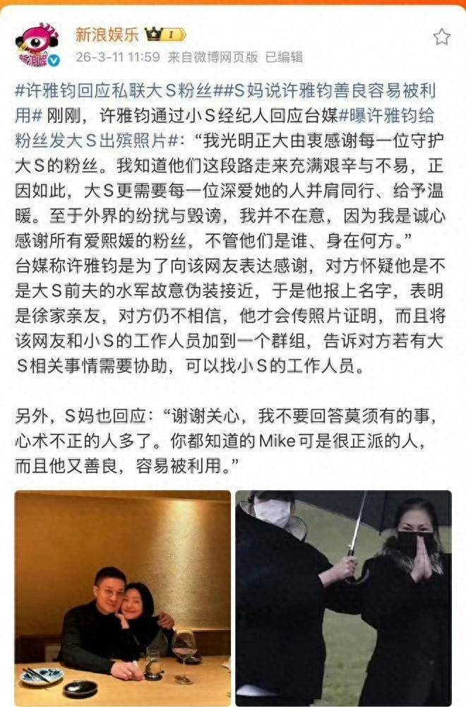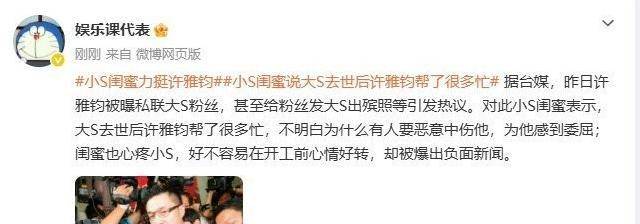 随着网 络上 的舆论 逐渐稳定,小S的 密友再次站出来发 表意见, 并对许雅钧感到 深深的不满。许雅钧在大S 逝世后 为他提供了 大量的帮助, 但她不 明白为 何要恶意 诋毁他!