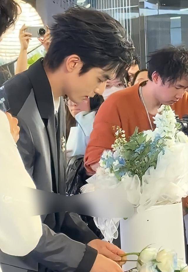 现场还有人抓拍到他低头插花的侧影,阳光透过玻璃洒在他身上,白衬衫的领口整齐,领带打得不松不紧,西装裤衬得他的腿又细又直,整个人干净又清爽,像从画报里走出来的贵公子,却又多了几分烟火气的温柔。