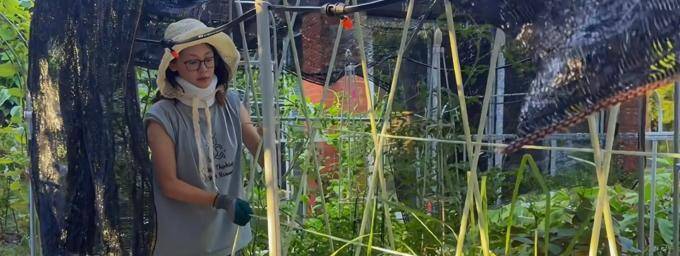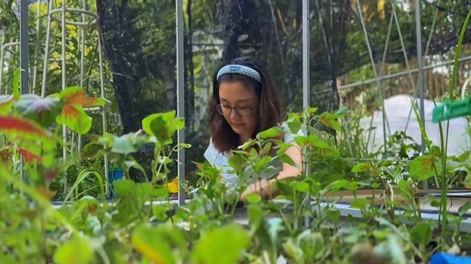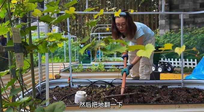 苗苗决定在 自己的别墅院子 里设立菜园 后, 就全心全意地投入了 工作,从搭 建架子到 亲手拔草 和施肥,有时 因为过于疲惫而不 愿多 言, 显得非常接地气。