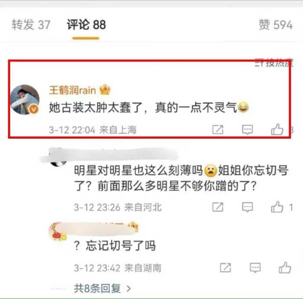 3 月 12 日晚,在讨论张凌赫与王玉雯新剧《刺棠》选角的博文下,王鹤润的实名认证账号突然留言:“她古装太肿太蠢了,真的一点不灵气。”