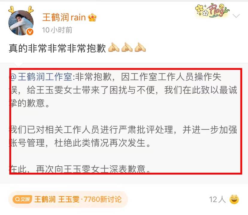 事件迅速发酵上了热搜,王鹤润工作室发文道歉,同时王鹤润转发。