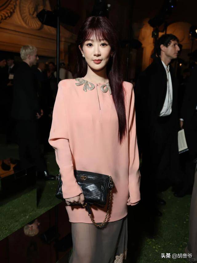 身上穿的是Valentino2026早秋系列的紫色礼裙,裙身带着精致的浮雕纹理,看着就很有质感。