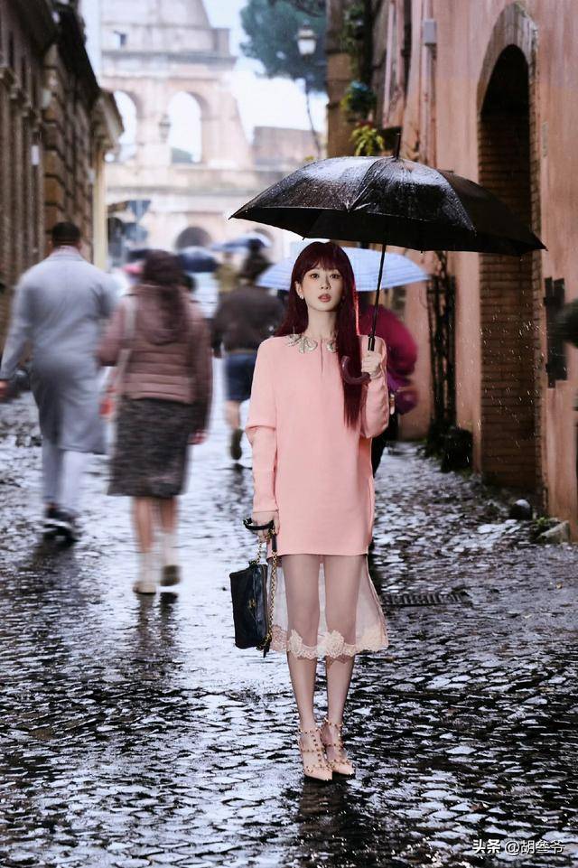 3月13日,短视频平台被杨紫的一组照片刷了屏。华伦天奴2026秋冬罗马大秀的现场,她顶着紫红色红发穿粉色礼裙雨中撑伞的画面,被G社的生图拍得氛围感拉满。可另一边,却有网友吐槽