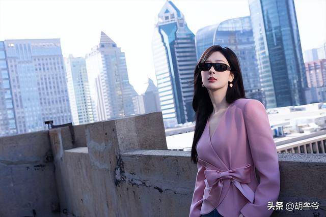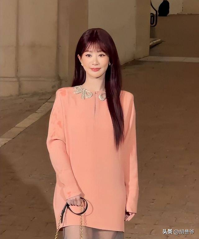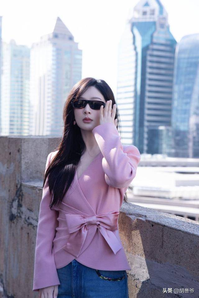 上海天台的高楼背景里,她留着清爽短发,穿华伦天奴粉色V领收腰西装,胸前的立体缎面蝴蝶结格外显眼。