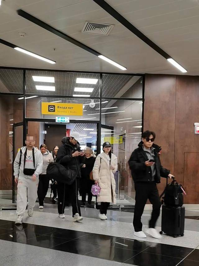 秦昊走在后面,跟伊能静有一小段距离。他戴一副墨镜,一身黑打扮,脚穿白色鞋,同样推着一个行李箱。这么看,他个子挺高的。
