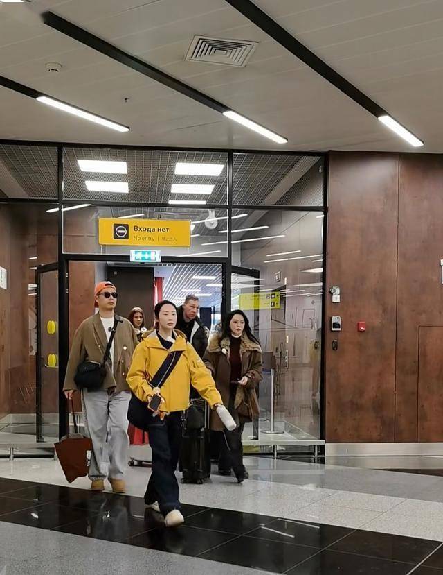 伊能静走在他们旁边,一头长发披肩,一身打扮很暖和,优雅又漂亮。她状态很好,看起来很年轻,自己一边走一边推行李箱。