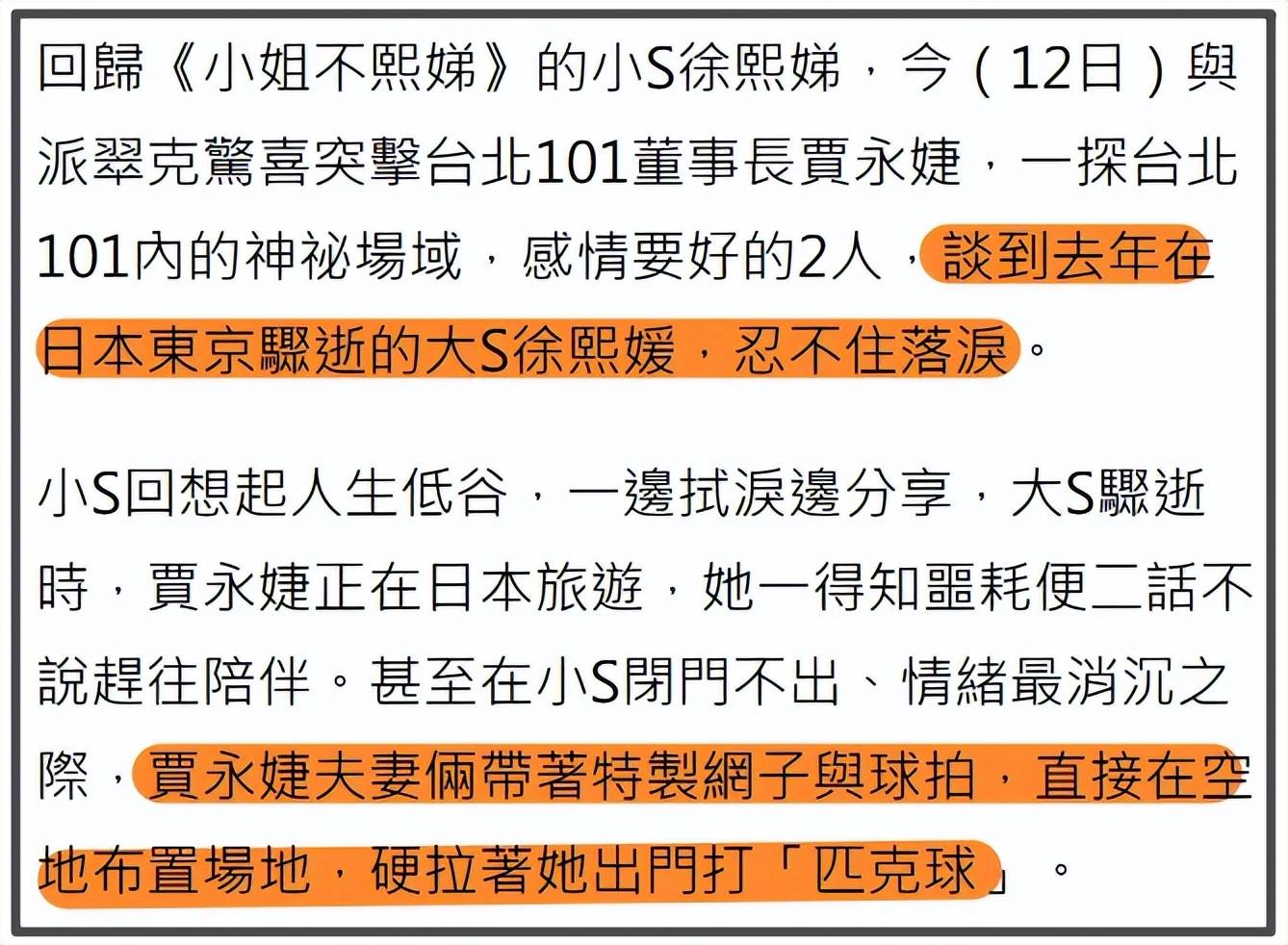 去找贾永婕为复工预热,也要提到大S,在贾永婕办公室泪崩,说自己曾一度无法走出,感谢贾永婕对她的帮助。
