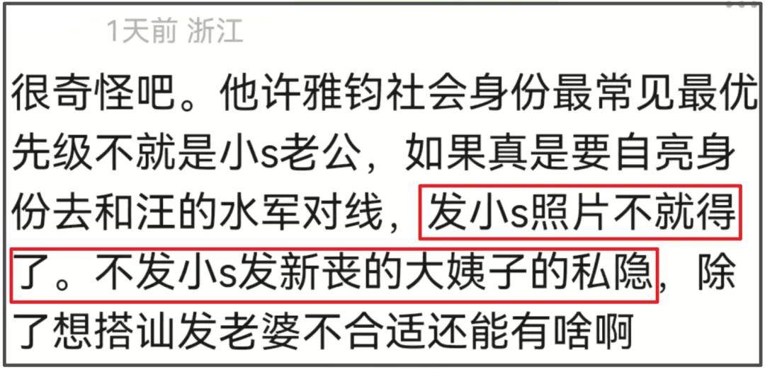 许雅钧想证明自己,为什么要发大S的出殡照?为啥不发小S在家痛哭祭拜的照片,不会没有吧?网友都想不出,许雅钧为什么要模糊自己“小S老公”的身份,而选择当“大S妹夫”。