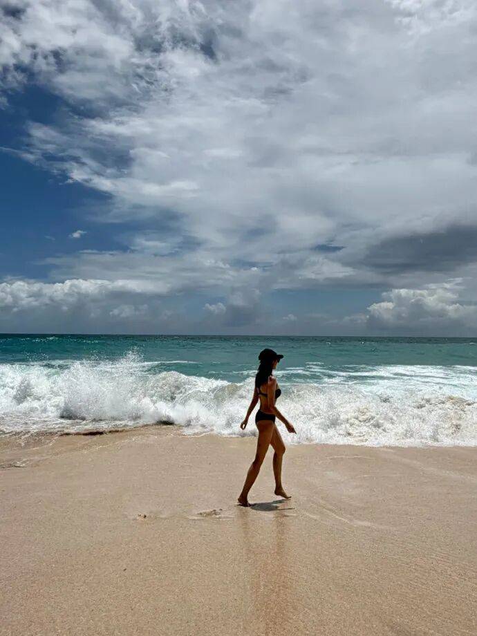 多数网友称赞其身材充满“健康的力量感”,绿色泳装与海景融合凸显清爽气质,光影下的皮肤被形容“闪闪发光”。