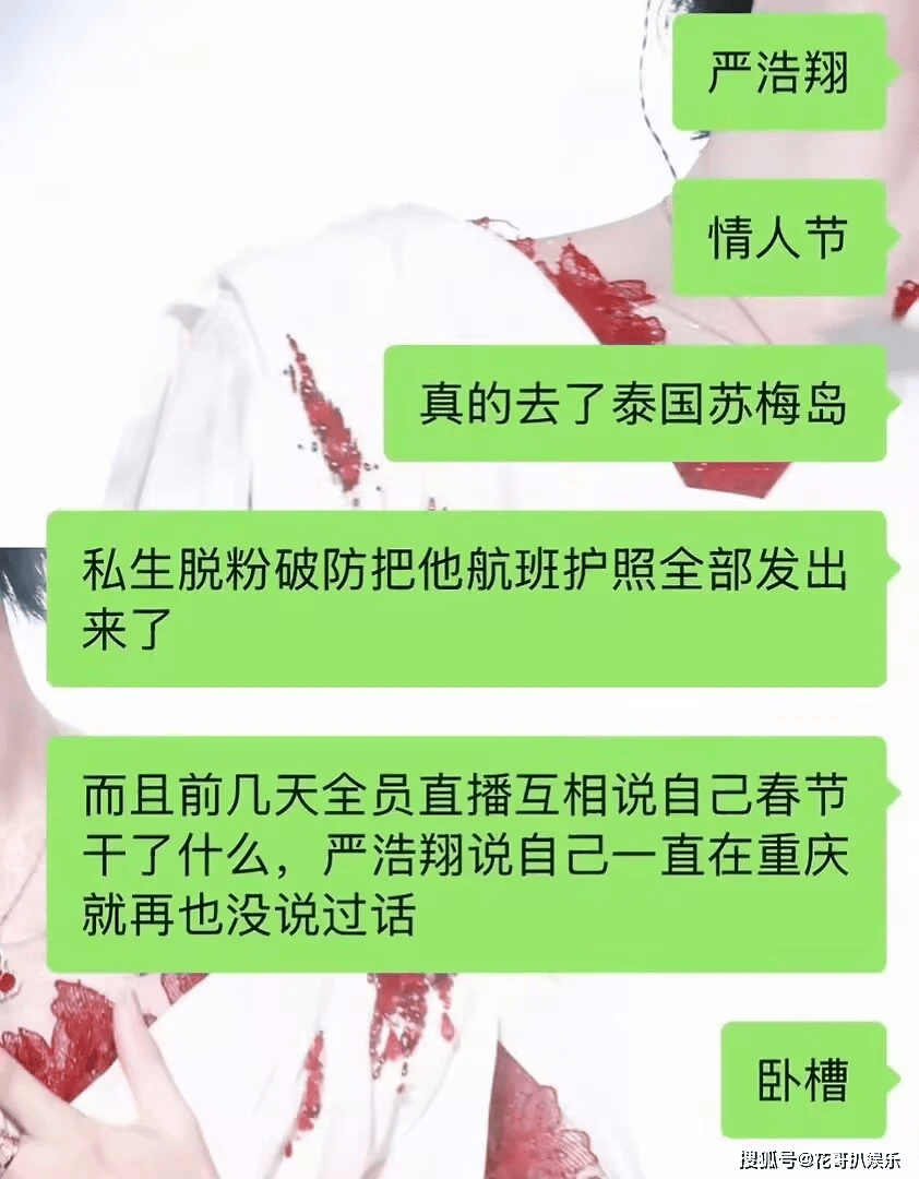 事情的起因是一位私生粉脱粉回踩。俗话说爱之深责之切,这位粉丝爆出的料详细得让人咋舌,直接把严浩翔情人节那几天的行踪扒了个底朝天。大家原本以为他就像直播里说的那样,在重庆安安分分过春节,结果人家玩了一手明修栈道,暗陈仓。