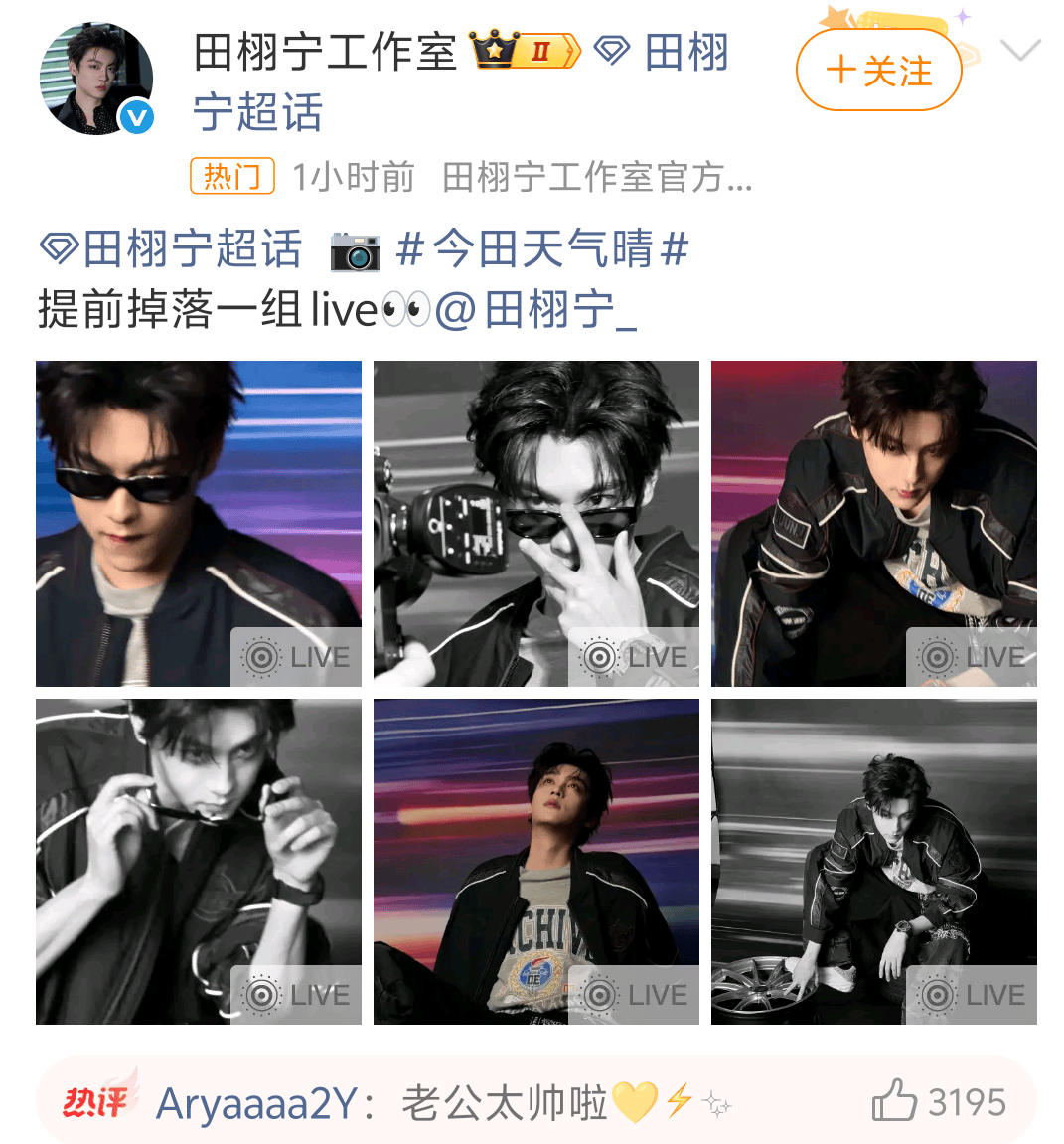 活动当天,粉丝的应援阵仗堪称“史诗级”——黄色玫瑰和大旗铺满看台,不知道的还以为在开“玫瑰主题派对”。田栩宁工作室发布的live动态图里,他慵懒随性地往那一站,气场强到能“把空气冻住”。粉丝集体“沦陷”:“这哪是来看赛车?这是来给‘老公’应援的啊!”“建议下次直接给赛道铺红毯,毕竟我们宁哥的排面不能输!”