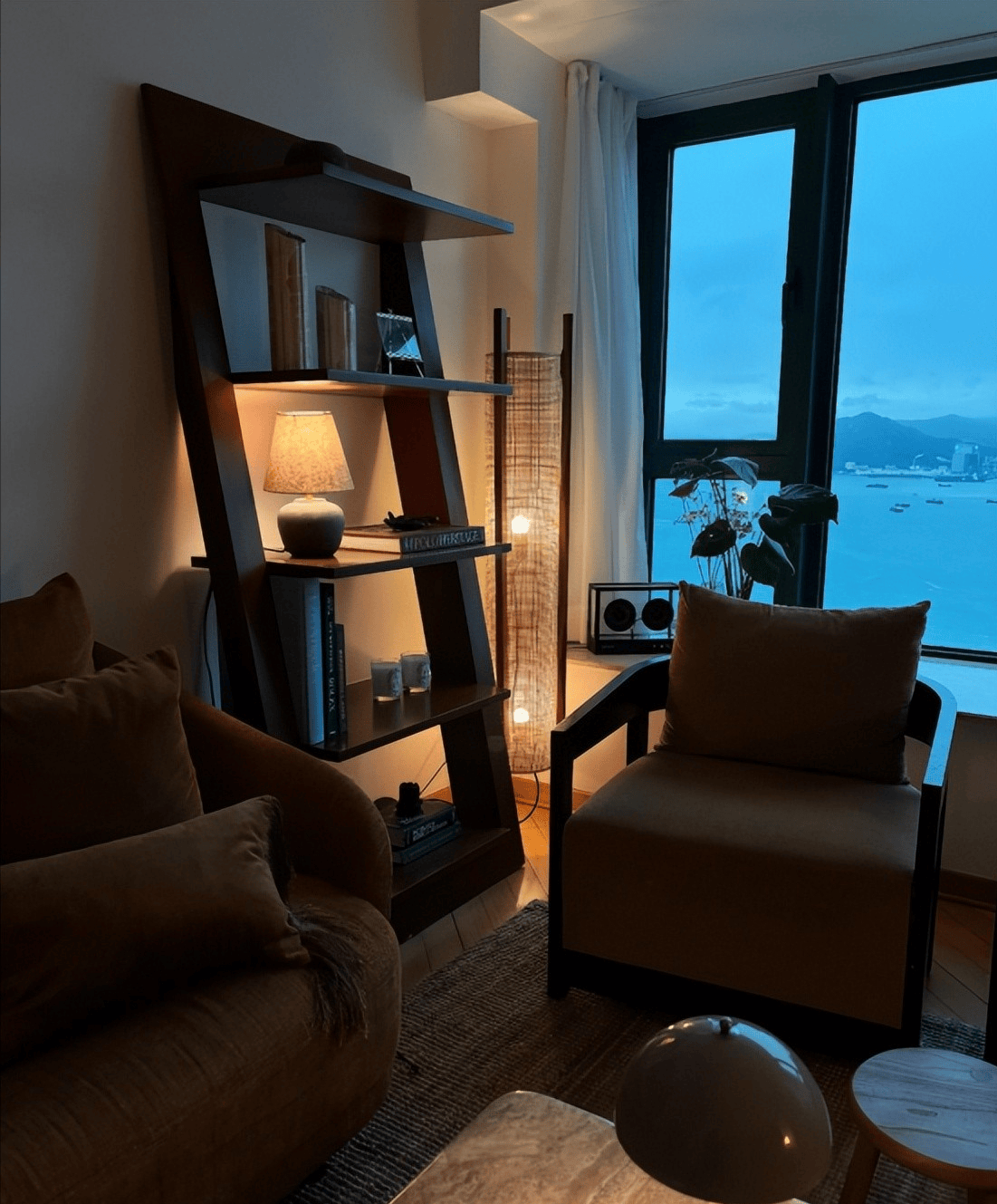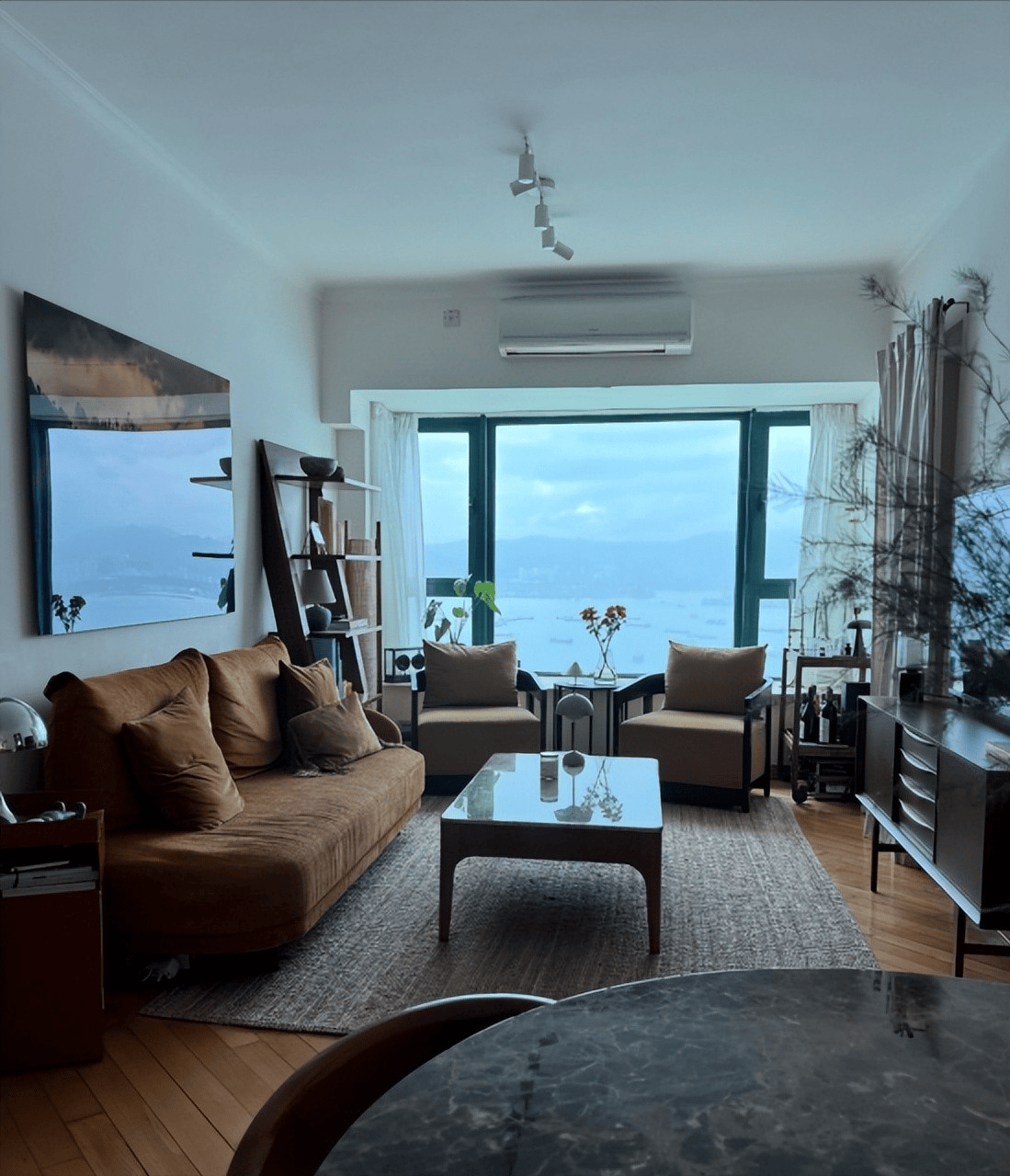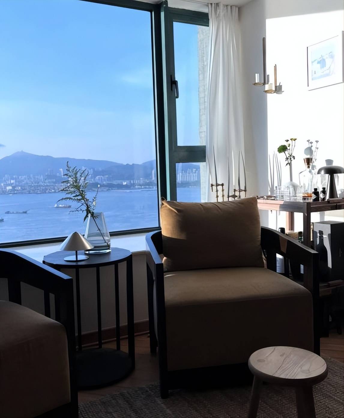 最吸睛的是巨型玻璃窗。窗外海景铺满视线,阳光进屋不费劲,屋里两张单人扶手椅靠窗一摆,像是专门留给“发呆”的位置。