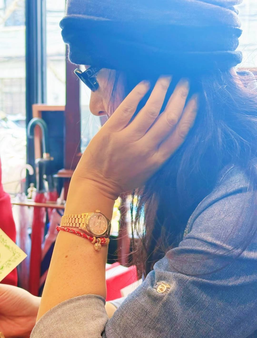 格子西装有点复古味,牛仔衬衫把人拉回日常,白色阔腿裤把整体气质托起来,松弛里带着利落。手上有腕表,有一条红绳金链,眼镜还是迪奥款。你说她讲究吧,她确实讲究。你说她刻意吧,又完全看不出“我要赢”的劲儿。