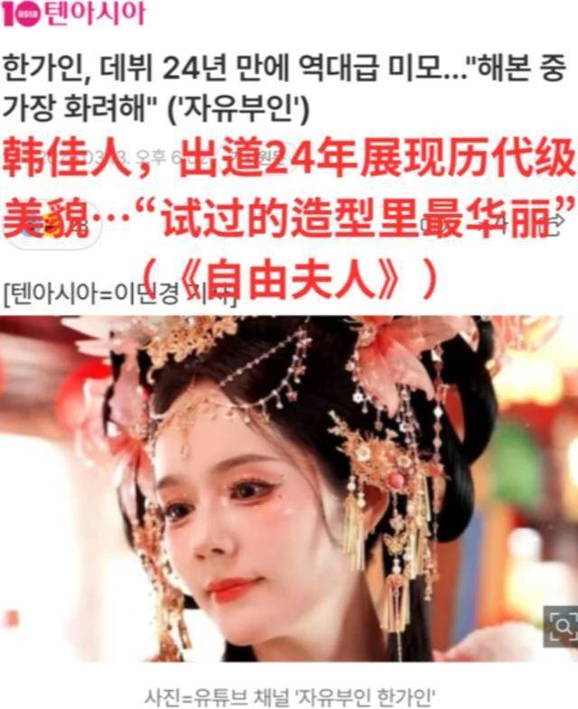 韩国媒体报道时就有点反差了,不仅不觉得她这套妆造难看,反而还用大标题夸赞她的美貌,称是她做过最华丽的造型。