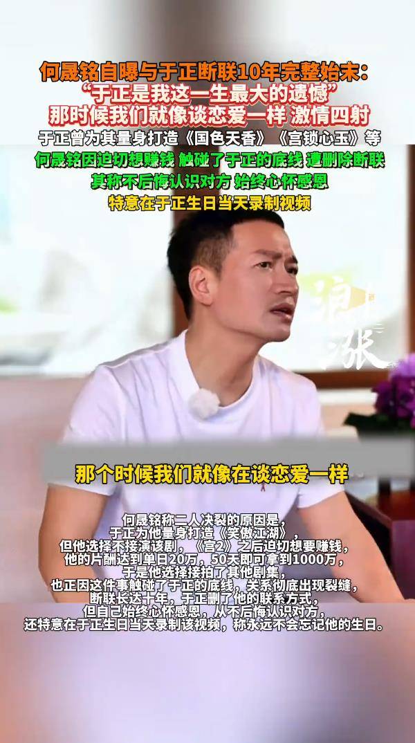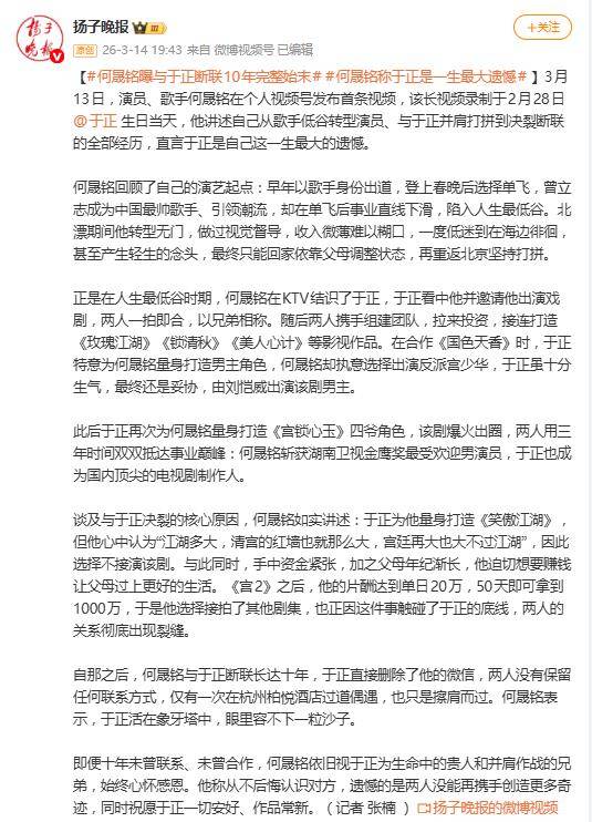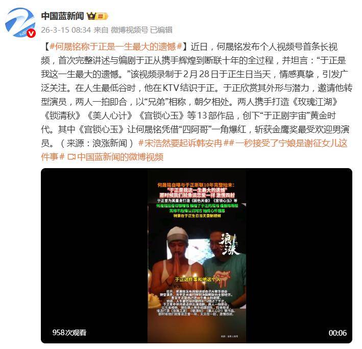 据3月15日报道,何晟铭在个人视频号发布的一条长视频,可谓在娱乐圈投下了一枚“回忆杀”炸弹。他不仅首次完整剖白了与编剧于正从亲密无间到断联十年的全过程,更用一句“于正是我这一生最大的遗憾”和“那个时候我们就像在谈恋爱一样”,瞬间点燃了全网对这段“意难平”关系的考古热情。