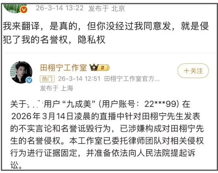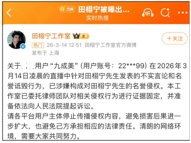 要知道田栩宁本人和所属公司都发过声明否认恋情和出轨了,并且放话会采取法律手段,还是有女网红顶着被起诉的压力出面自曝,完全没有把男方声明放在眼里。
