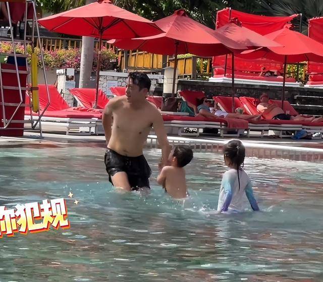 泳池边的互动更是高光时刻,郑恺陪着儿子宣宣、大女儿安娜玩水嬉戏,被两个孩子联手“偷袭”泼水。