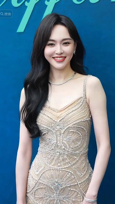 裙子的金属质感很强,在灯光下闪着细碎的光芒,修身的剪裁精准勾勒出她的优雅曲线,整个人温婉又有气场。