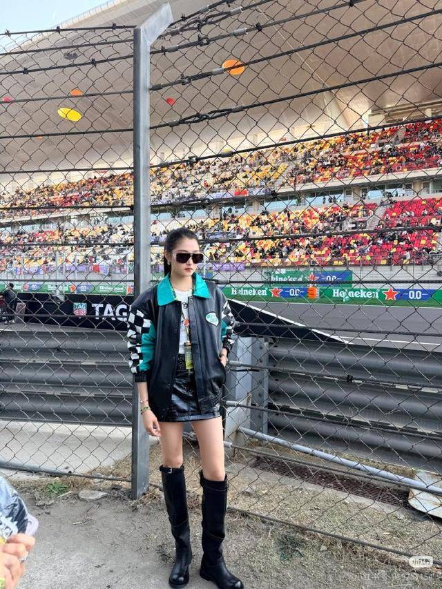 这次F1现场的穿搭,恰恰抓住了她的身材优势,简约的短裙加长筒靴,既符合赛事的氛围,又凸显了她的少女感和酷飒气质。