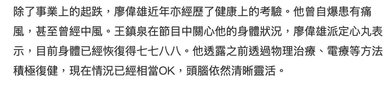 现年68岁,曾经在90年代活跃的TVB小生廖伟雄与TVB约满后就退出转行经商了,而从商后的事业也发展得有声有色。近些年移居马来西亚的他在当地开了“七星级餐厅”,打造了一个名为星厨私宴的饮食王国,还在当地开设生产“鱼蛋”的工厂,被形容事业迎来第二春。不过廖伟雄已经68岁了,身体这些年也出现了问题,早些时候他自曝自己中风,身体情况一度令人担忧,罕见他在中风后露脸并接受访问大谈个人近况,力证健康暂无大碍。
