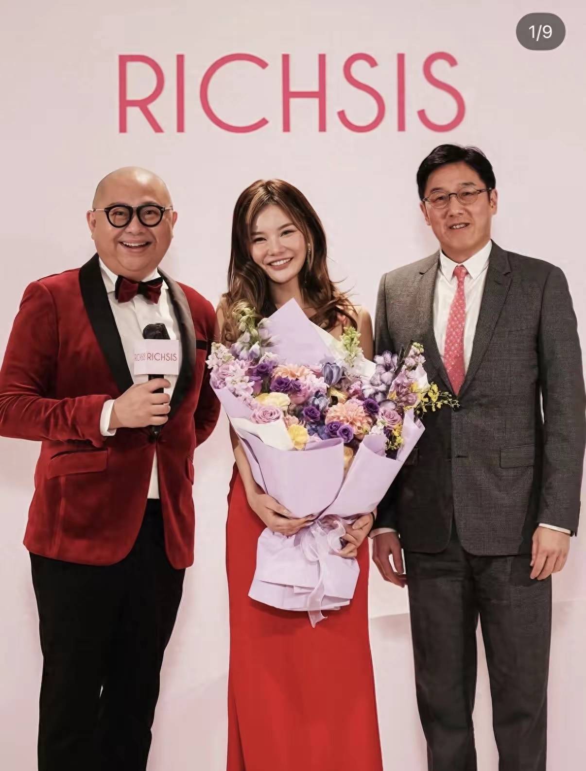 钟睿心就像是一个胜利者,穿一袭明艳的红裙、留着大波浪的长发,温柔妩媚。手捧鲜花、笑的明媚。不深究、还真觉得俩人挺般配。