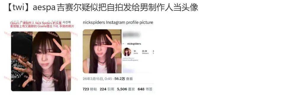 音乐制作人Nick Spiders被网友发现将其社交账号的头像更换为吉赛尔的未公开照片。该照片此前未被粉丝或公众所见,且无官方发布记录。Nick Spiders曾参与吉赛尔的个人音乐制作,两人在录音室合作期间,现场出现过标注“WICKSPIDERS”的设备,证实其工作关联。