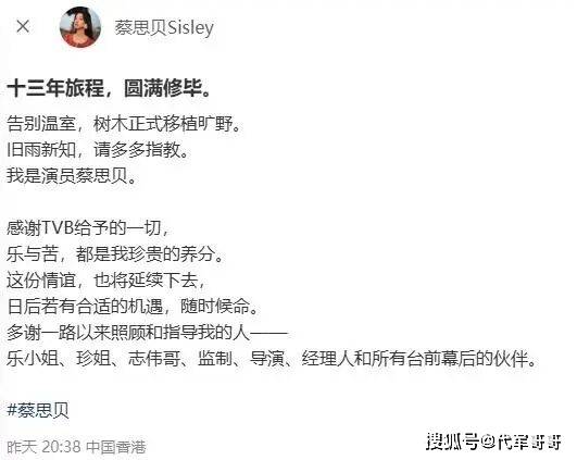 近日,35岁TVB前视后蔡思贝的近况正式曝光,她于3月12日晚通过社交平台与TVB长达13年的合作关系,一句“告别温室,树木正式移植旷野”,道尽了这段旅程的落幕与对未来的期