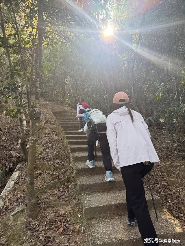 还有孩子们一起爬石阶梯的照片,郭晶晶走在后面。儿子霍中曦走在妈妈前面。