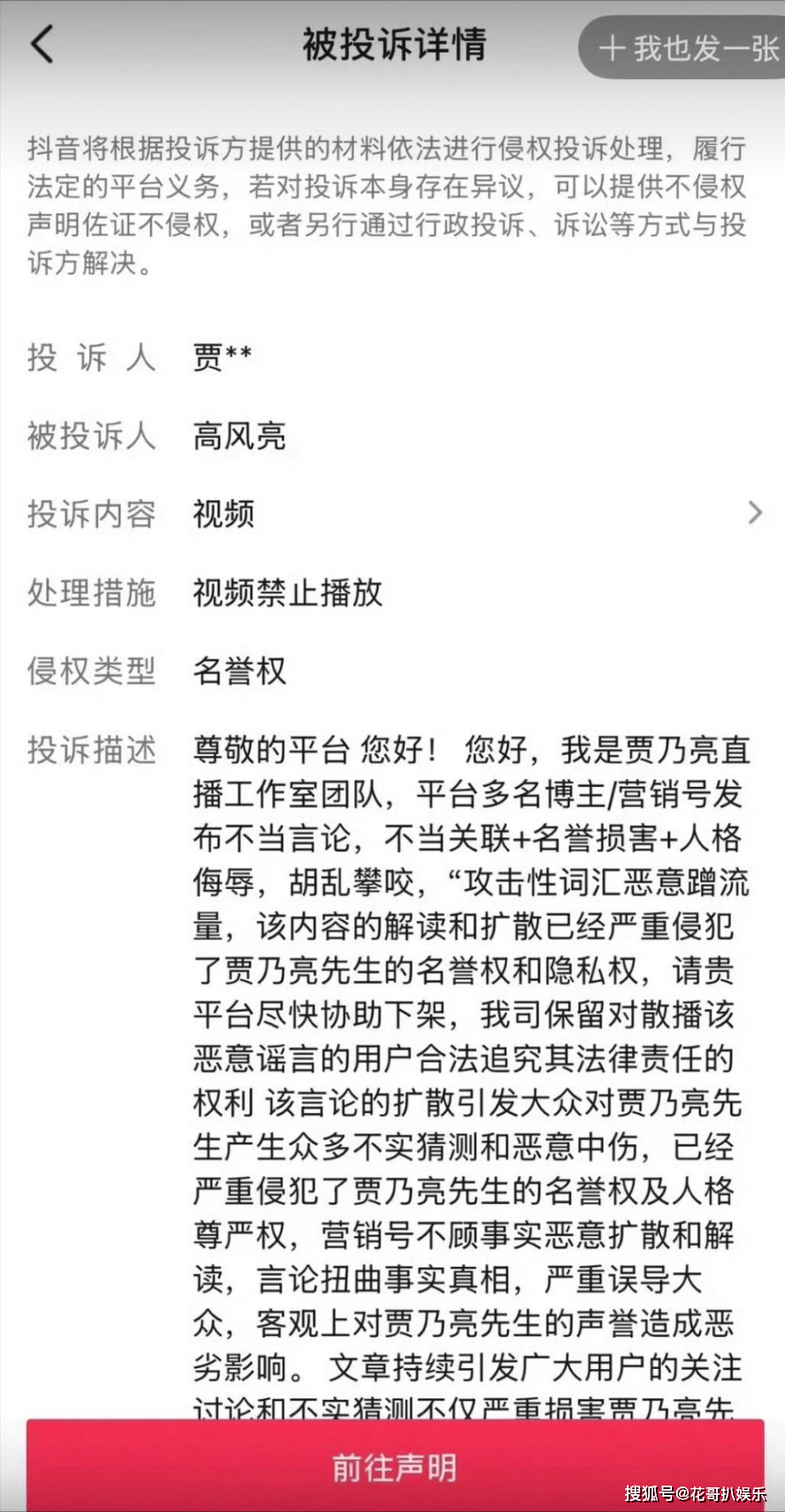 事情的起因是抖音上一个叫“高风亮”的博主,拍了几个模仿PG One的视频。这博主模仿得还挺投入,从穿搭到标志性动作,甚至连说唱的调调都学了个十成十。按理说,模仿秀在短视频平台一抓一大把,只要不造谣、不辱骂,通常也就图一乐呵。但这次,贾乃亮工作室却罕见地动了真格,直接一纸诉状以侵犯名誉权为由把视频给举报了,平台审核后也迅速判定投诉成立,相关视频全部下架。