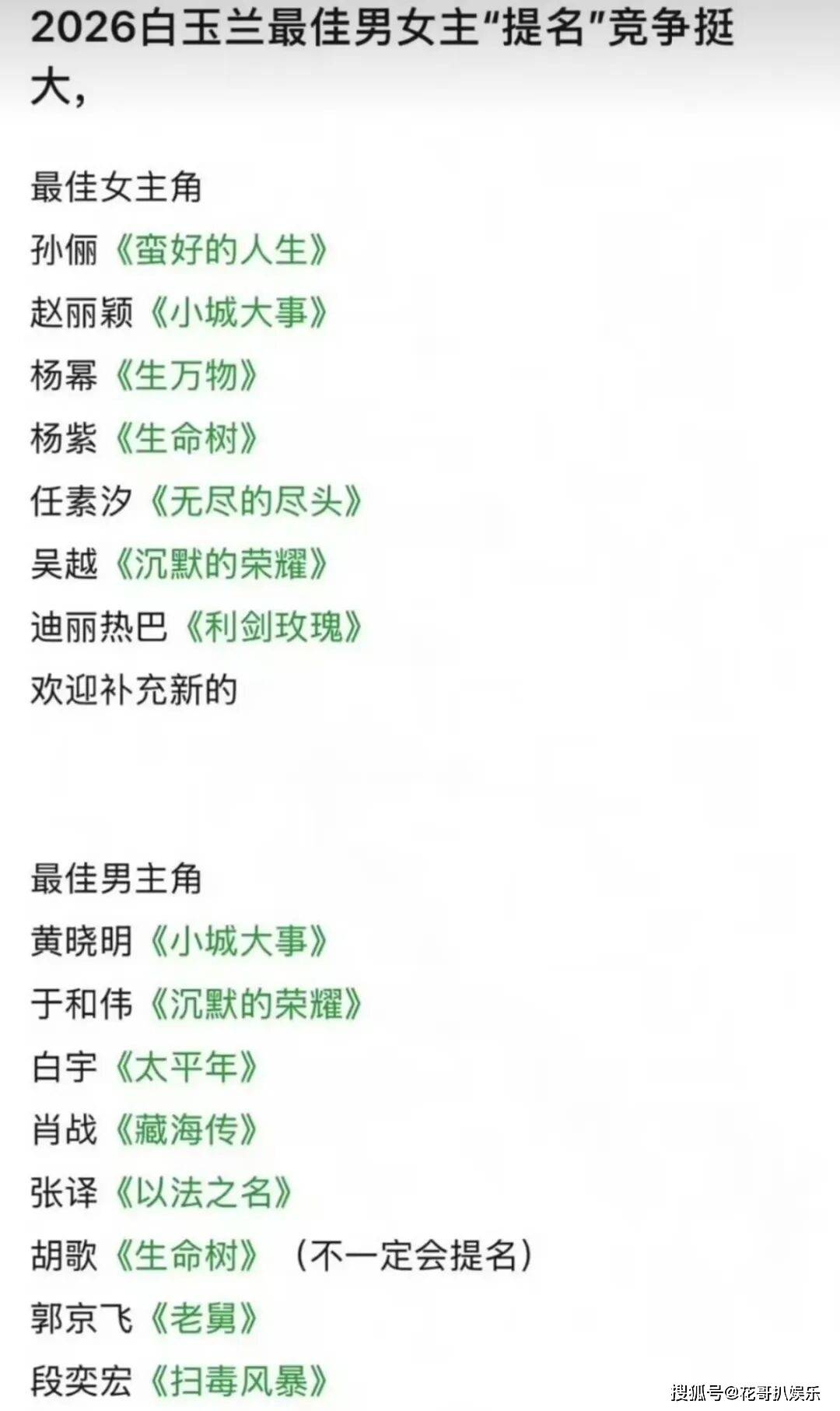 2026年的白玉兰奖还没开始报名呢,网上的口水战就已经打得不可开交了。尤其是最佳女主角这个赛道,简直就是神仙打架,看得人眼花缭乱。最近一份网友预测的提名名单流出,今年视帝