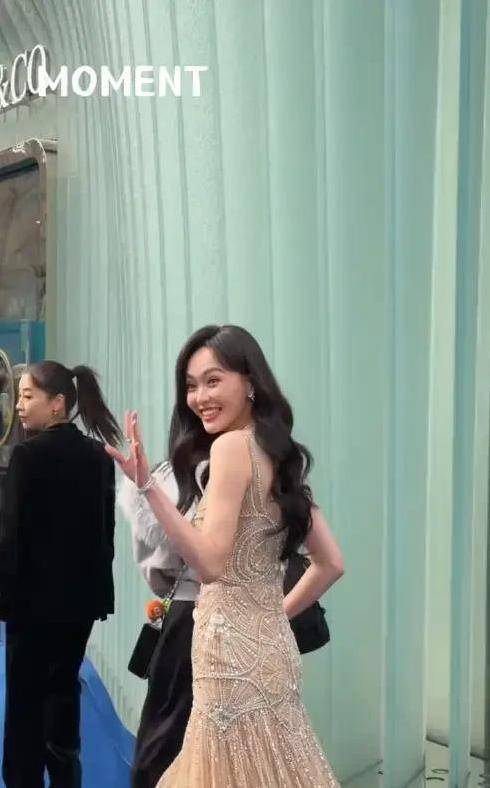 那一天,唐嫣首次亮相,她身穿一条金色的吊带长裙,黑色的长卷发从肩膀垂下。她所散发出的气质和身材,以及她的温柔,都深入骨髓地展现出来,粉丝们都目不转睛地注视着她。