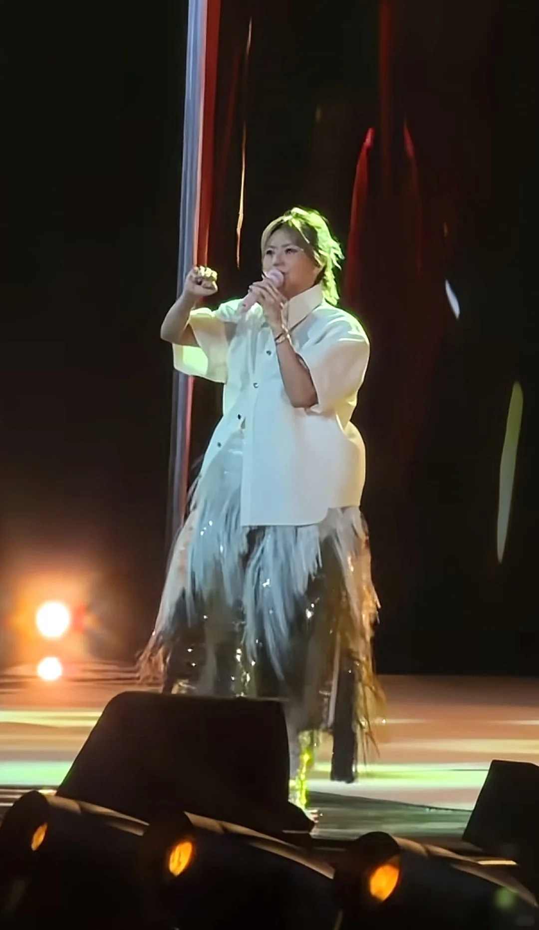在这五套服装里,有四套都栽在了基本功上,白衬衫配上宽裙,腰线消失不见,人看起来又矮又胖,连高跟鞋也拉不回来;那身海胆装满身是刺,裹得密不透风,不像舞台造型,倒像是临时凑合的道具;蓝白纱裙用了便宜的化纤料子,灯光一打就塌下去,远远看着就像一百个口罩叠在一起;肩垫和裙边做成锯齿形状,明显是赶工出来的粗糙活,连她自己都没往官方账号上发,大概也觉得不太满意。