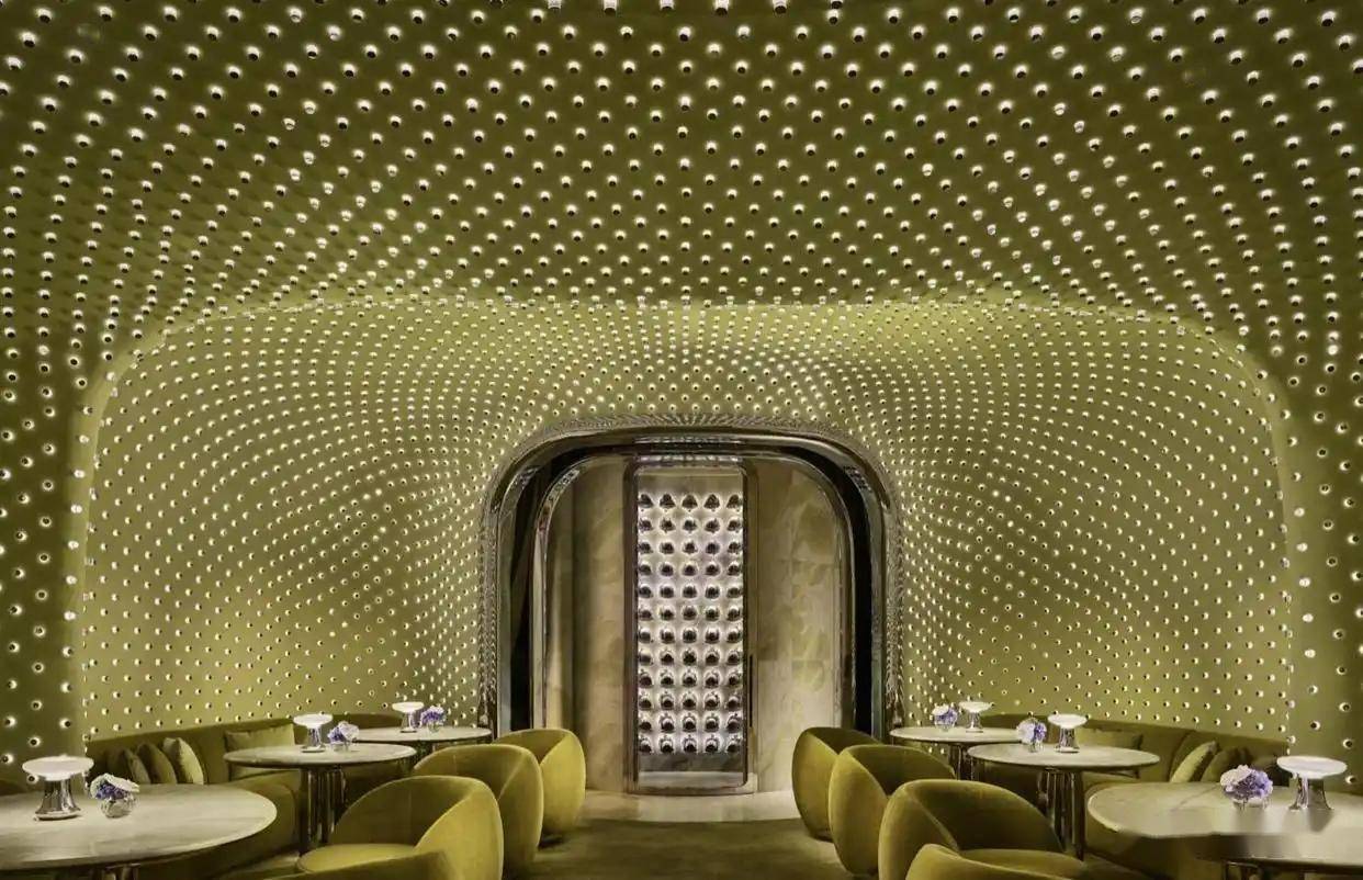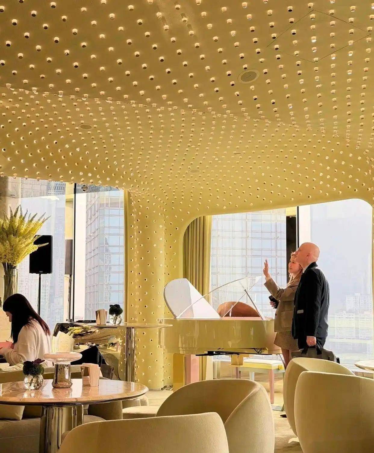 最令人震撼的是天花板和墙体上镶嵌了数以万计的手工灯泡,灯光亮起时犹如繁星点点,营造出极具未来感和艺术感的沉浸式氛围。 餐厅中央摆放着一架白色三角钢琴,在特定灯光下,钢琴和天花板会泛出暖金色的光泽。