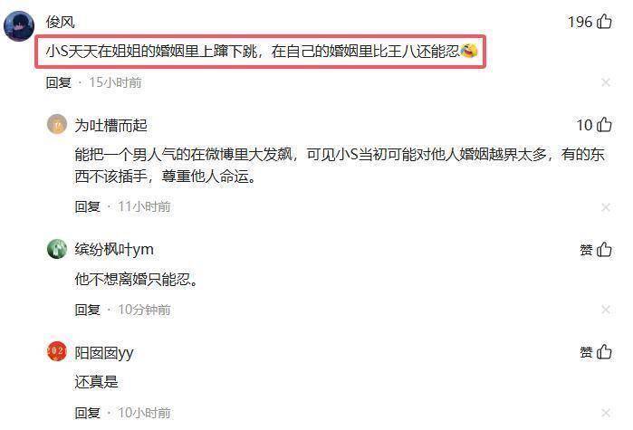 网友如此评论:小S天天在姐姐的婚姻里上蹿下跳,在自己的婚姻里,比什么都能忍。