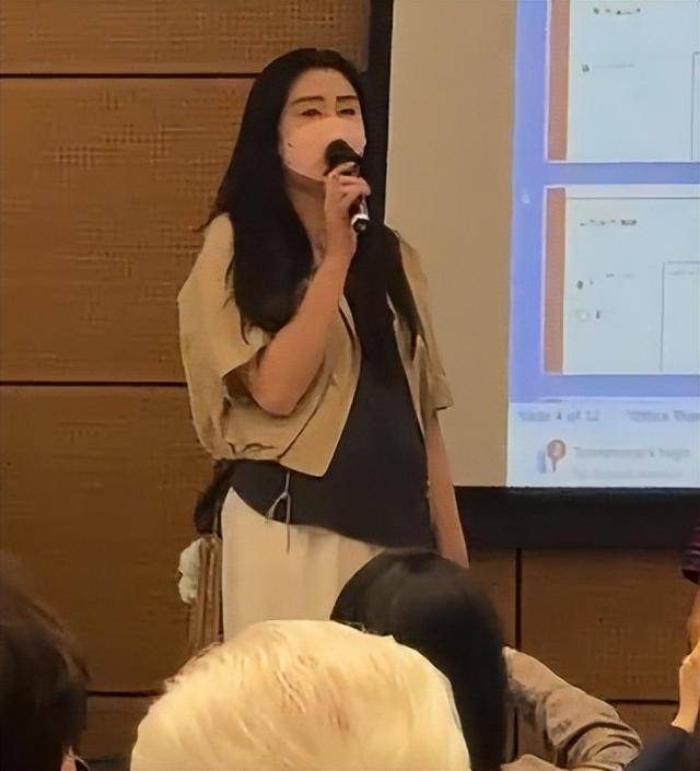 在演讲的时候,大脸盘格外显眼,双下巴也藏不住,肚子上的赘肉把宽松的衣服都撑出了弧度,大腹便便的样子,跟记忆里那个眉目含情、身姿窈窕的聂小倩,完全搭不上边。
