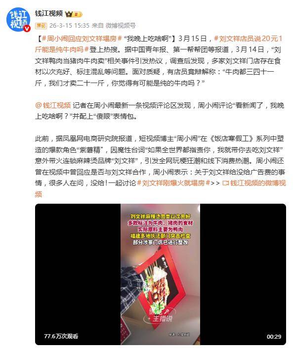 从“带你去吃刘文祥”的深情承诺,到“晚上吃啥啊”的灵魂拷问,这反转来得猝不及防。周小闹的调侃,看似轻松,却戳中了一个深层现实:在流量为王的时代,网红一句无心之言可能成就一个品牌的短期爆火,但产品与诚信的“里子”一旦塌方,所有由流量堆砌的热闹,终将化为泡影,只留下一地鸡毛和消费者“晚上吃啥”的迷茫。