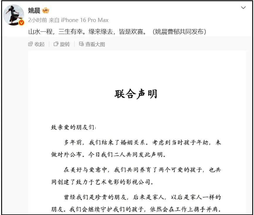 姚晨和曹郁一样逃不过,姚晨再次离婚之后,尽管双方竭力表现出体面,离婚声明都字字斟酌,还是有爆料称姚晨的第二任丈夫也出了轨。