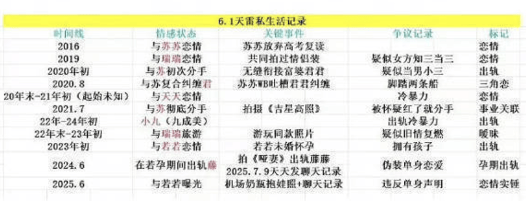 没过多久,吃瓜网友就整理出了一张田栩宁走红后被曝光的十年恋爱清单。