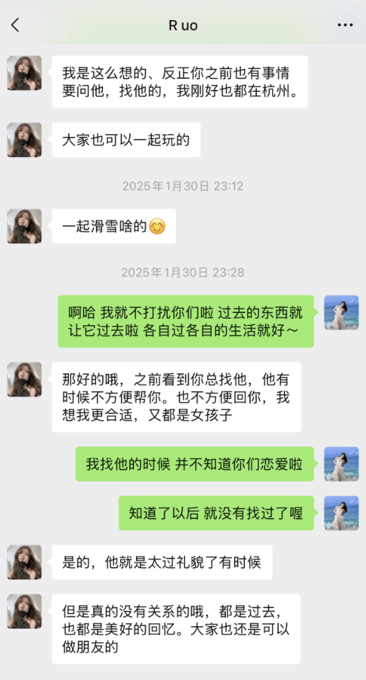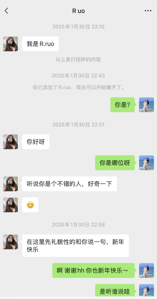据九成美晒出的聊天记录显示,从2025年1月开始,若若就通过各种方式添加她为好友。