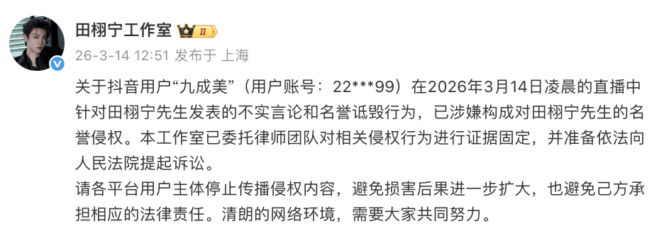 毕竟,田栩宁方曾多次发布声明强调“单身、未婚、未育”,且在今年年初刚告赢过造谣者,算是略有经验。