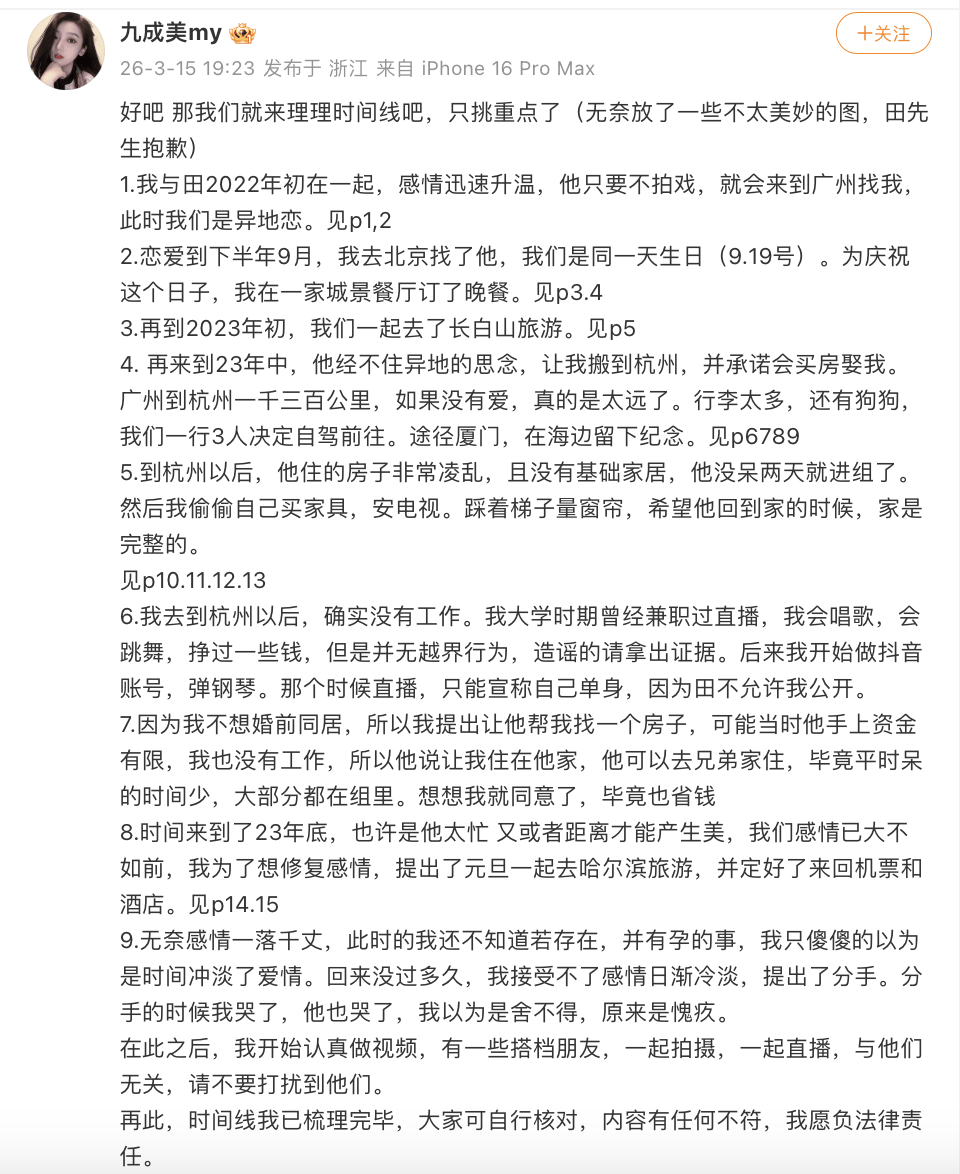 他在文中透露,九成美初到杭州时曾借住在田栩宁家,而她“一次次为了搞直播和维护大哥,在冬天把田栩宁赶出家门”,田栩宁却只能叹息自己没本事。