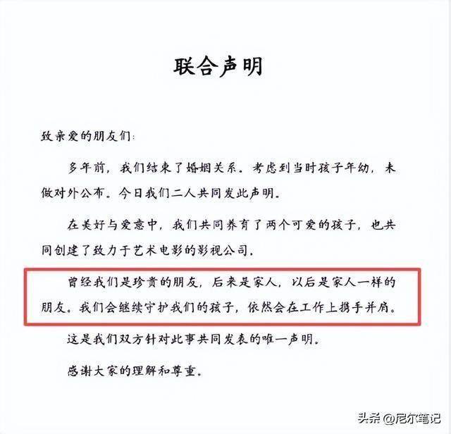还坦言 “曾经我们是珍贵的朋友,后来是家人,以后是家人一样的朋友”,寥寥数语,宣告了这段维持十余年的婚姻正式落幕。